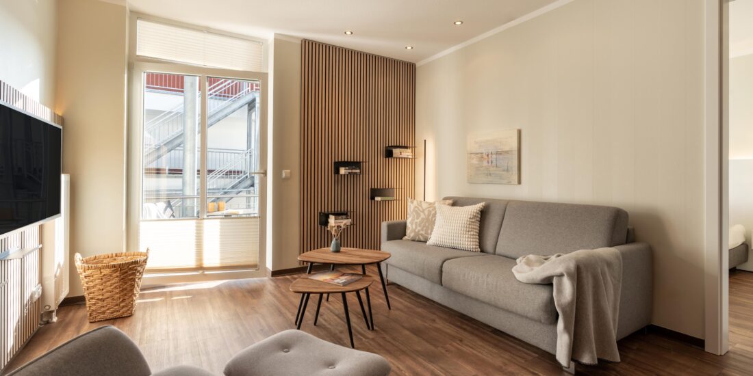 Die Rodehuus Wohnung 7 verfügt über ein separates Schlafzimmer und einen großen sonnigen Balkon, von welchem sich der Blick über den Garten hin zum Neuen Leuchtturm öffnet. Die Besonderheiten der Unterkunft sind der großzügige Zuschnitt und das schöne Badezimmer mit dem bodengleich gefliesten Duschraum und den Natursteinfliesen. Die hochwertig ausgestattete Küchenzeile verfügt neben allen wichtigen Utensilien zum Kochen über einen Geschirrspüler, eine Nespresso Kapsel Maschine und einen Backofen. Die Mitnahme von Haustieren ist hier nicht gestattet, sodass die Wohnung auch von Allergikern gerne gebucht werden kann. Eine Waschmaschine und ein Wäschetrockner, jeweils mit einem Münzautomat, stehen für die Allgemeinheit zur Verfügung.