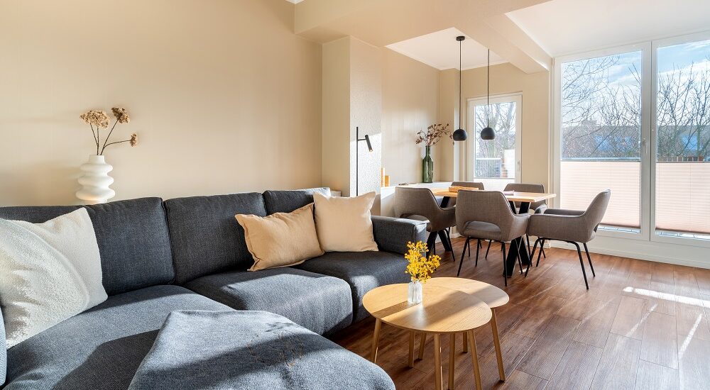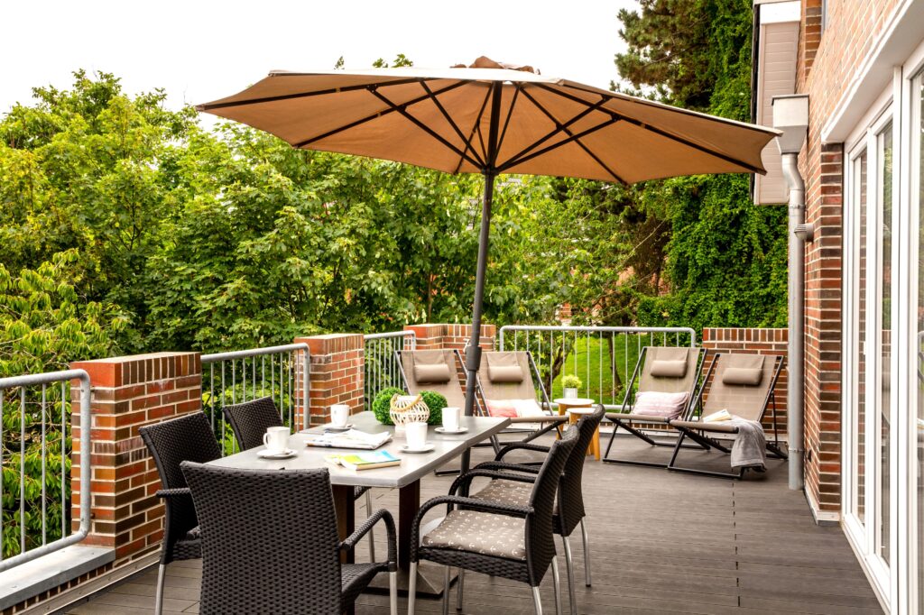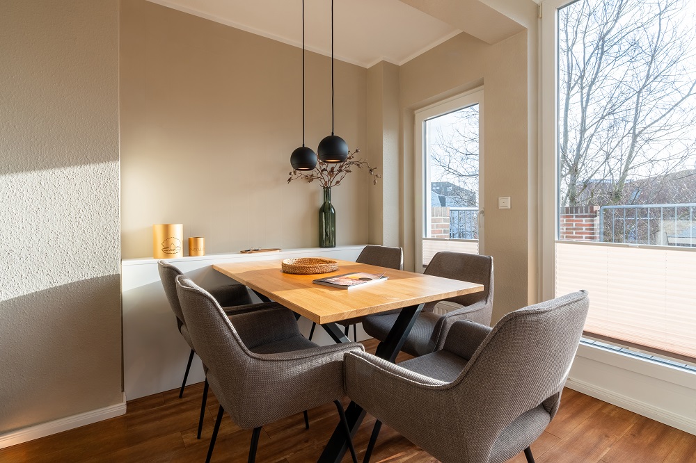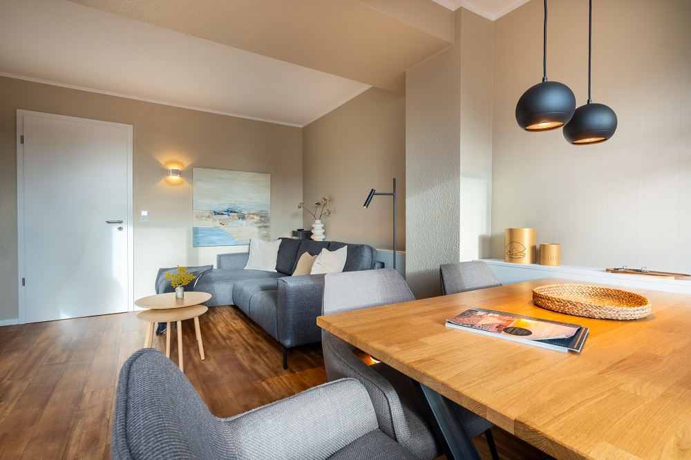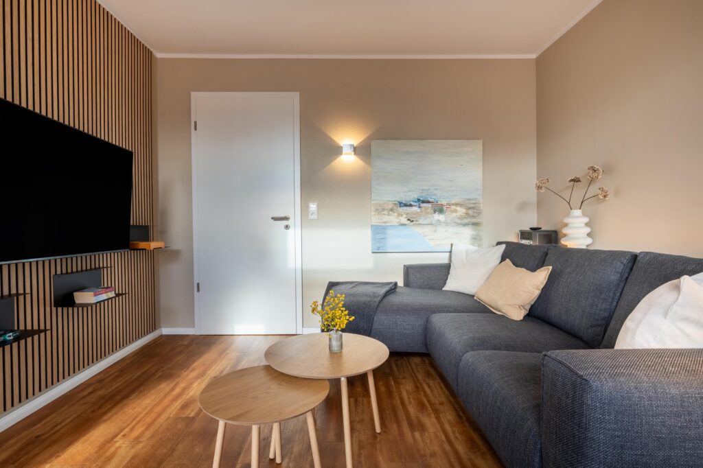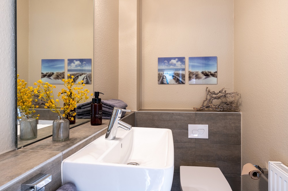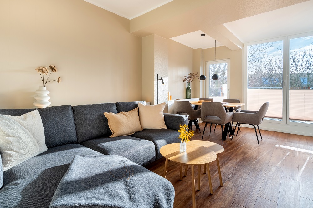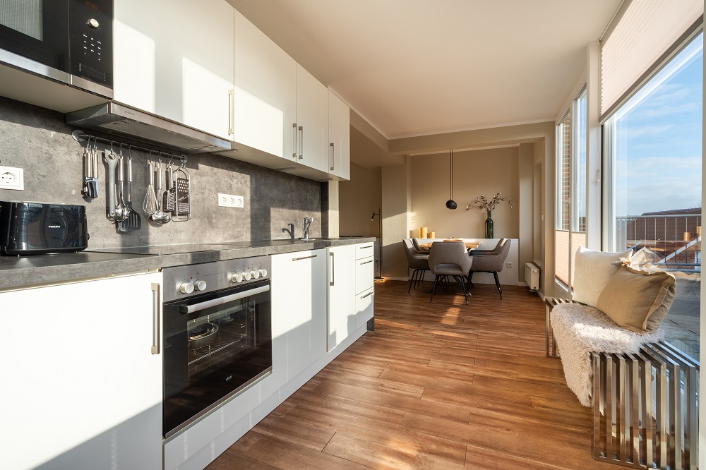 Die Riff5 Wohnung 4 verfügt über drei separate Schlafzimmer (jeweils mit einem Flachbildfernseher) und einer riesigen Dachterrasse (Süd-Ost-Ausrichtung) mit Liegestühlen und einem Sonnenschirm. Eine große Glastürenfront bildet den Übergang der Wohnung zur Terrasse. Die Besonderheiten der Unterkunft sind der großzügige, funktionale Zuschnitt (81m²), das schöne, hochwertige Badezimmer mit dem bodengleich gefliesten Duschraum und den Natursteinfliesen und das zusätzliche Gäste-WC. Die vollwertig ausgestattete Küchenzeile verfügt neben allen wichtigen Utensilien zum Kochen über einen Geschirrspüler, eine Nespresso-Kapselmaschine und einen Backofen. Im Haus befindet sich eine Sauna, welche gegen ein geringes Entgelt (Münzautomat) genutzt werden kann. Entsprechende Saunapakete, bestehend aus einem Saunahandtuch und einem Bademantel, können Sie gerne direkt bei uns für 12,00 € pro Person buchen. Die Mitnahme von Haustieren ist hier nicht gestattet, sodass die Wohnung auch von Allergikern gerne gebucht werden kann. Eine Waschmaschine und ein Wäschetrockner, jeweils mit einem Münzautomat, stehen für die Allgemeinheit zur Verfügung.