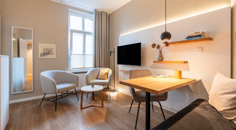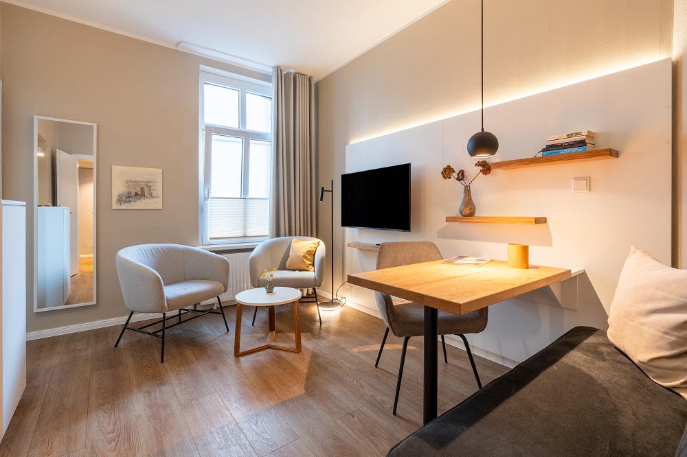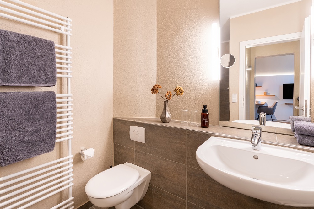 Das Woge2 Appartement 4 verfügt über ein separates Schlafzimmer. Die Besonderheiten der Unterkunft sind der funktionale Zuschnitt und das schöne Badezimmer mit dem bodengleichen Duschraum und den Natursteinfliesen. Die hochwertig und voll ausgestattete Teeküche mit einer Nespresso-Kapselmaschine verfügt über alle wichtigen Utensilien zum Zubereiten einer Kleinigkeit. Die Mitnahme eines Hundes ist für einmalig 20,00 € und einem Preis von 10,00 € pro Nacht möglich. Eine Waschmaschine und ein Wäschetrockner, jeweils mit einem Münzautomat, stehen für die Allgemeinheit zur Verfügung.