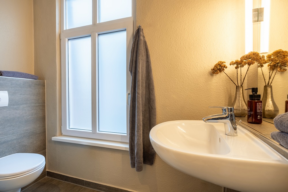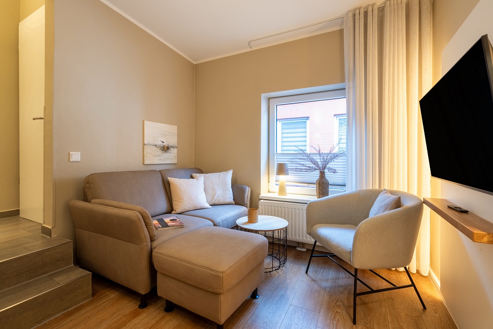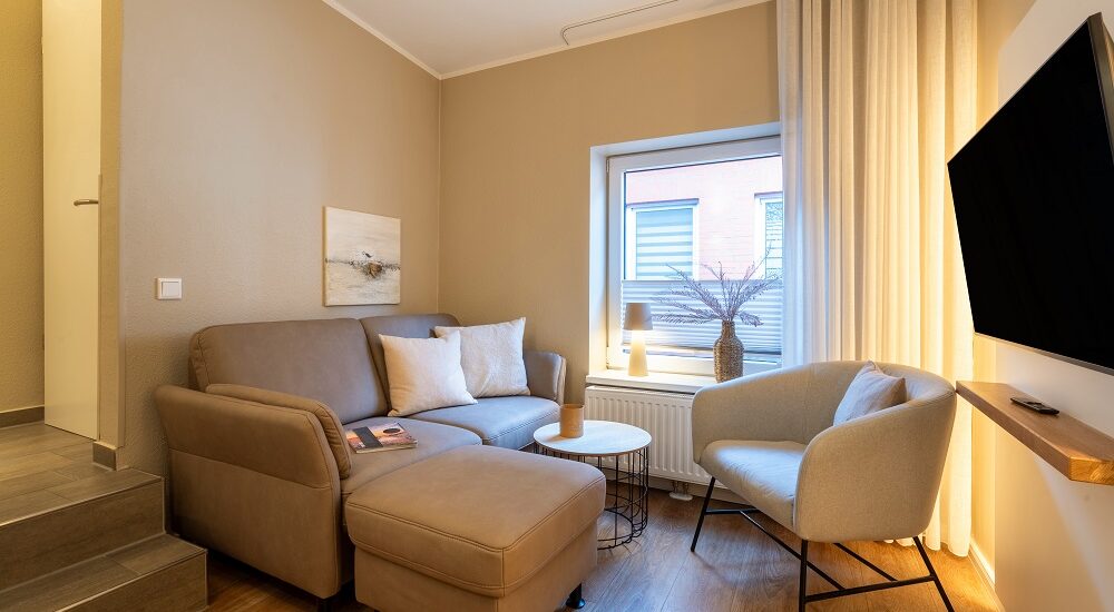 Das Woge2 Appartement 5 verfügt über ein separates Schlafzimmer. Die Besonderheiten der Unterkunft sind der funktionale Zuschnitt und das schöne Badezimmer mit dem bodengleichen Duschraum und den Natursteinfliesen. Die separate hochwertig und voll ausgestattete Teeküche mit einer Nespresso-Kapselmaschine verfügt über alle wichtigen Utensilien zum Zubereiten einer Kleinigkeit. Es gibt (getrennt vom Wohnbereich) einen kleinen Essplatz im Bereich der Kaffeestation. Die Mitnahme eines Hundes ist für einmalig 20,00 € und einem Preis von 10,00 € pro Nacht möglich. Eine Waschmaschine und ein Wäschetrockner, jeweils mit einem Münzautomat, stehen für die Allgemeinheit zur Verfügung.