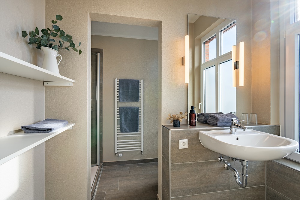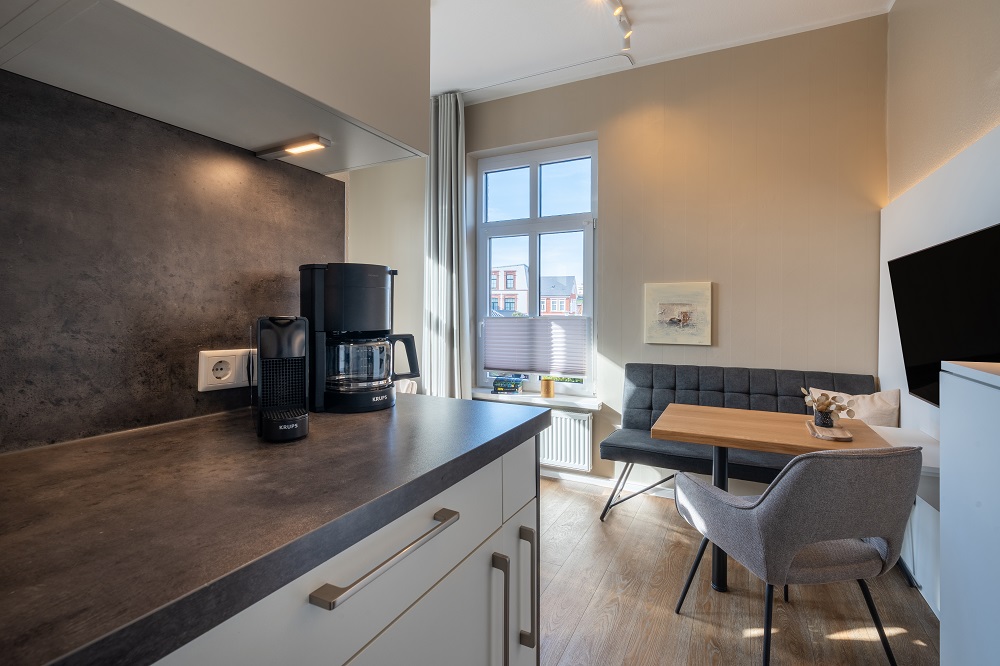 Das Woge2 Appartement 7 verfügt über ein separates Schlafzimmer. Die Besonderheiten der Unterkunft sind der funktionale Zuschnitt und das schöne großzügige Badezimmer mit dem bodengleichen Duschraum und den Natursteinfliesen. Die hochwertig und voll ausgestattete Teeküche mit einer Nespresso-Kapselmaschine verfügt über alle wichtigen Utensilien zum Zubereiten einer Kleinigkeit. Die Mitnahme von Haustieren ist hier nicht gestattet, sodass die Unterkunft auch von Allergikern gerne gebucht werden kann. Eine Waschmaschine und ein Wäschetrockner, jeweils mit einem Münzautomat, stehen für die Allgemeinheit zur Verfügung.
