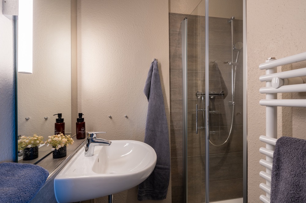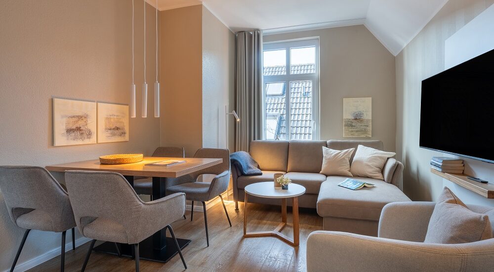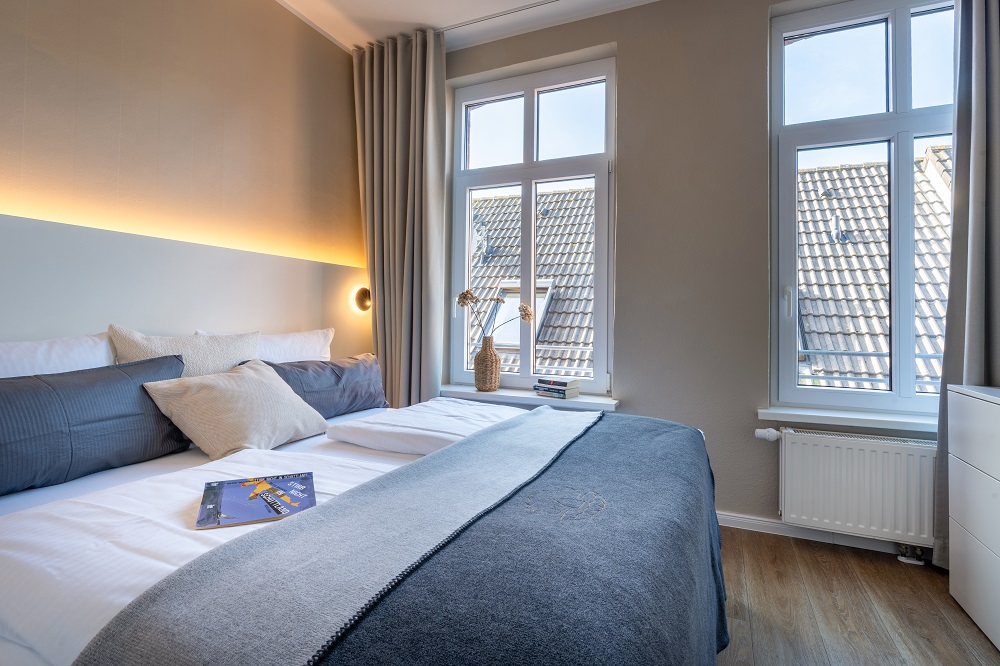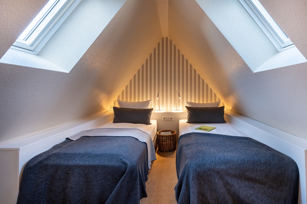 Das Woge2 Appartement 9 verfügt über zwei separate Schlafzimmer. Das Kinderschlafzimmer ist über ein kleines Ankleidezimmer erreichbar und bietet mit seiner Dachschräge unvergleichliche Gemütlichkeit. Die Besonderheiten der Unterkunft sind der funktionale Zuschnitt und die Trennung des Bades in einen Duschraum und eine separates WC. Die hochwertig und voll ausgestattete Teeküche mit einer Nespresso-Kapselmaschine verfügt über alle wichtigen Utensilien zum Zubereiten einer Kleinigkeit. Die Mitnahme eines Hundes ist für einmalig 20,00 € und einem Preis von 10,00 € pro Nacht möglich. Eine Waschmaschine und ein Wäschetrockner, jeweils mit einem Münzautomat, stehen für die Allgemeinheit zur Verfügung.