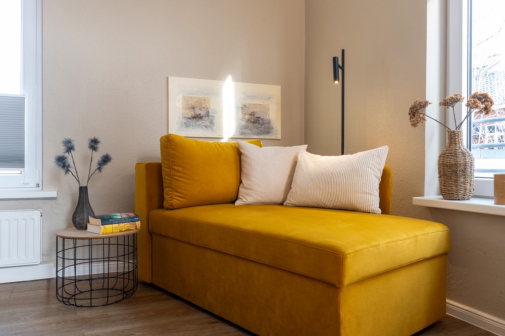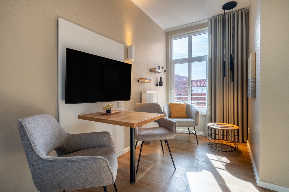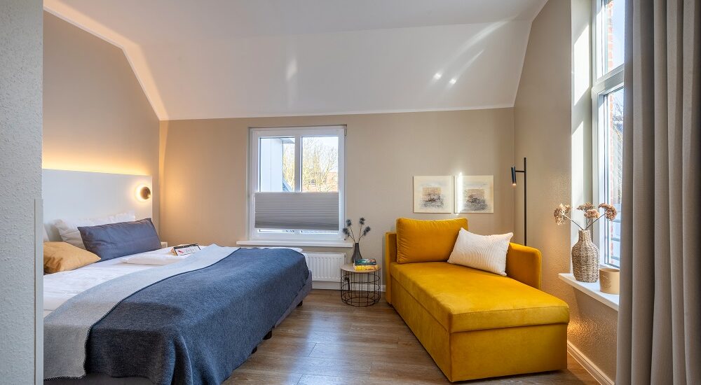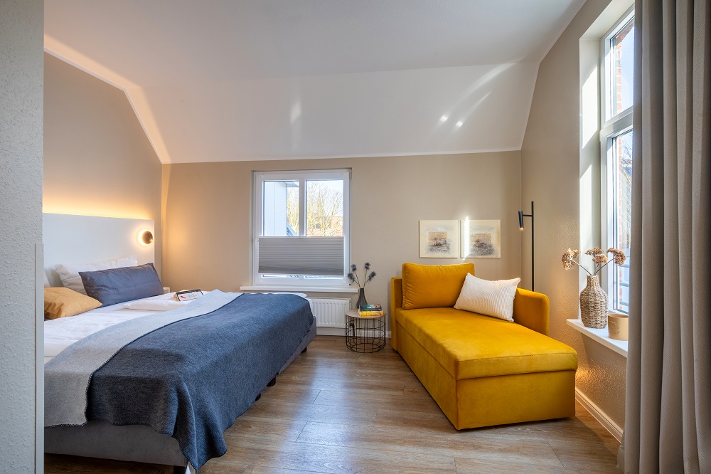 Das Woge2 Appartement 10 verfügt über einen kombinierten Wohn- und Schlafbereich. Die Besonderheit der Unterkunft ist der funktionale Zuschnitt und das schöne Badezimmer mit dem bodengleich gefliesten Duschraum und den Natursteinfliesen. Die hochwertig und voll ausgestattete Teeküche mit einer Nespresso-Kapselmaschineverfügt über alle wichtigen Utensilien zum Zubereiten einer Kleinigkeit. Zusätzlich steht im offenen Schlafbereich eine Schlafcouch zur Verfügung.