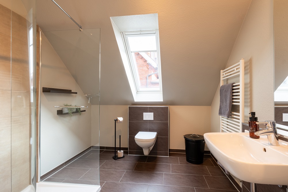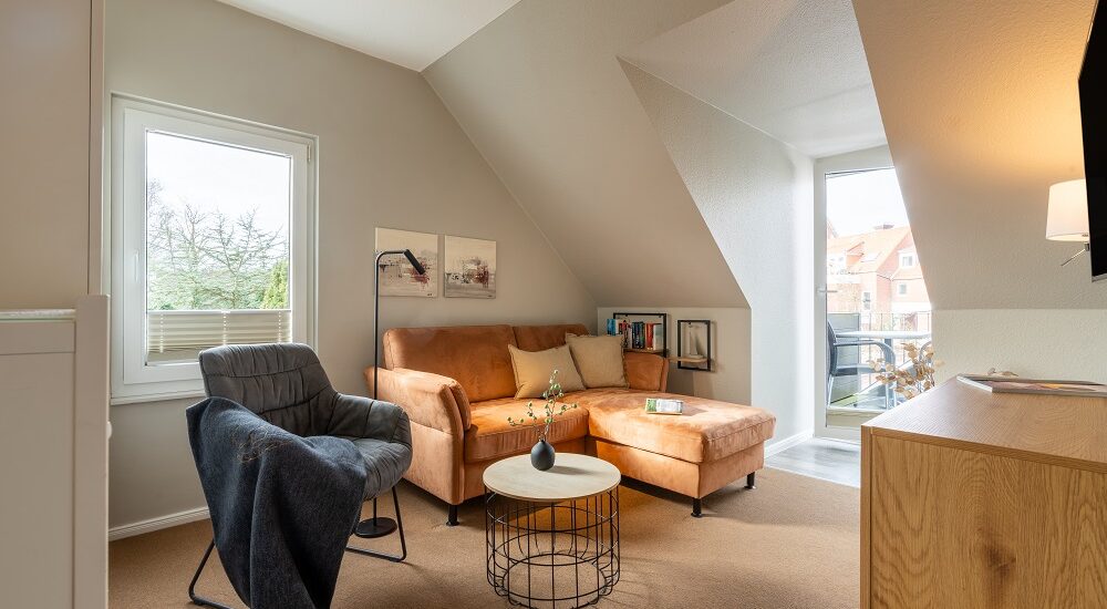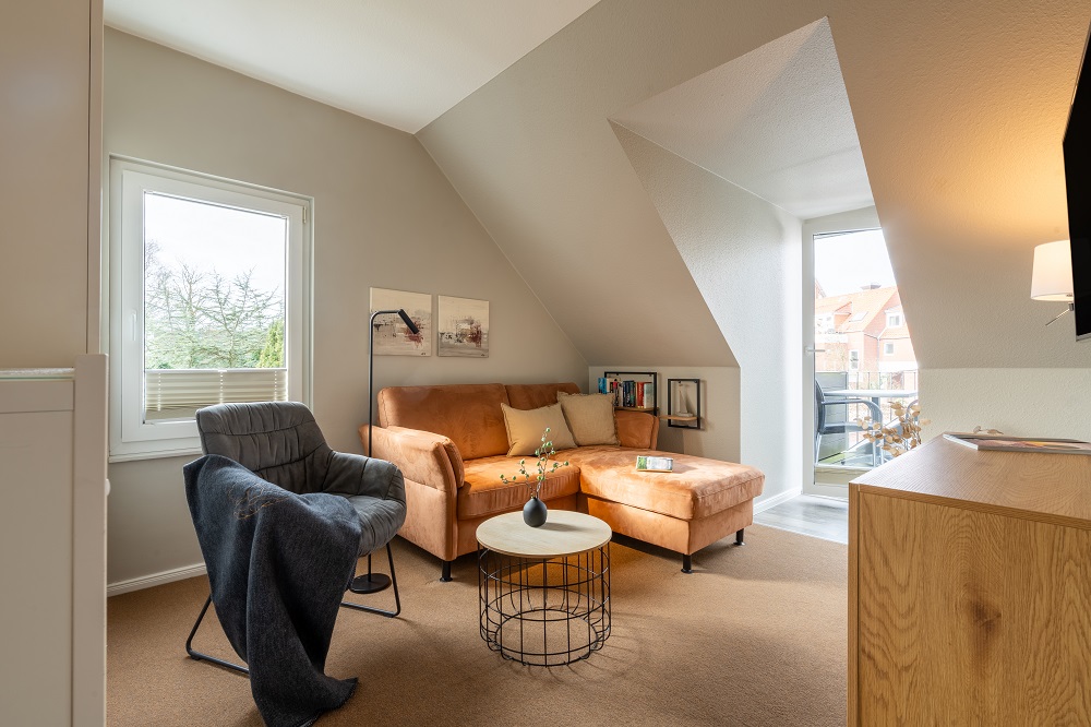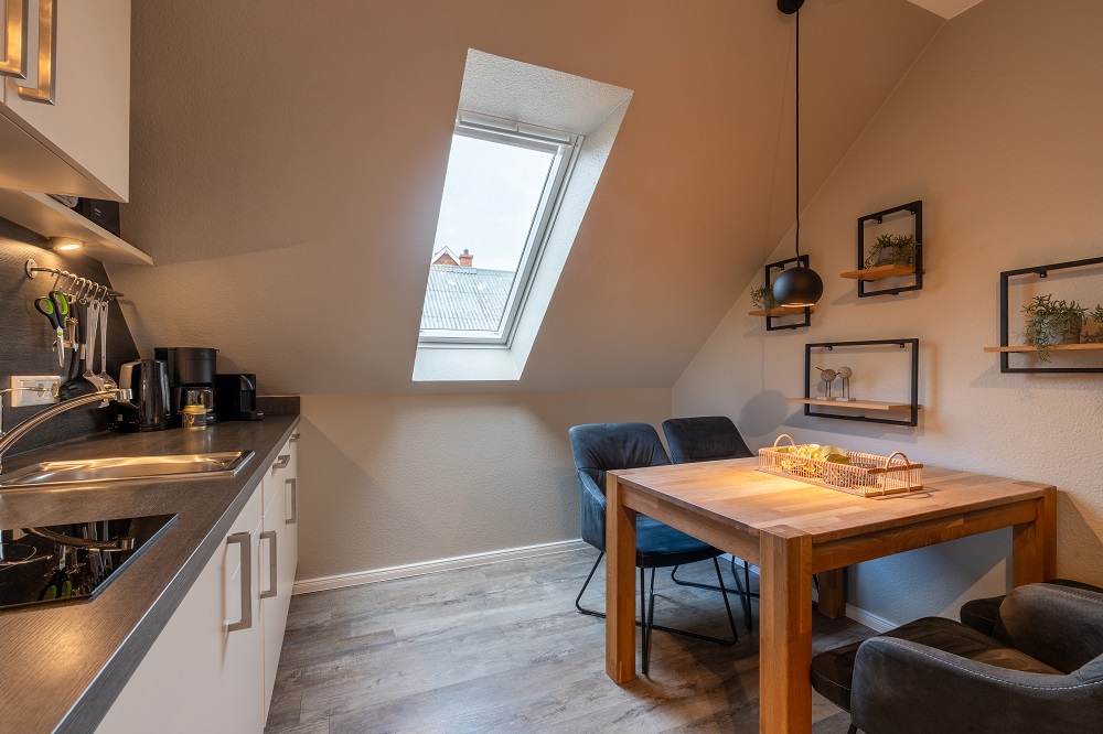Das kombinierte Wohn- und Schlafzimmer des Appartement 3 ist einladend mit Sofa, Fernseher und großem Doppelbett eingerichtet. Von hier aus gelangen Sie auf den kleinen Süd-West-Balkon, auf welchem Sie den Tag ausklingen lassen können. Der Essbereich mit Küchenzeile und Geschirrspüler wurde räumlich abgetrennt, sodass hier eine optische Aufteilung zum Wohnbereich vorhanden ist. Auch das Badezimmer mit bodengleich gefliester Dusche rundet den Wohnungszuschnitt optimal ab. Die Mitnahme von Haustieren ist hier nicht gestattet, sodass die Unterkunft auch von Allergikern gerne gebucht werden kann.Eine Waschmaschine und ein Wäschetrockner, jeweils mit einem Münzautomat, stehen für die Allgemeinheit zur Verfügung.