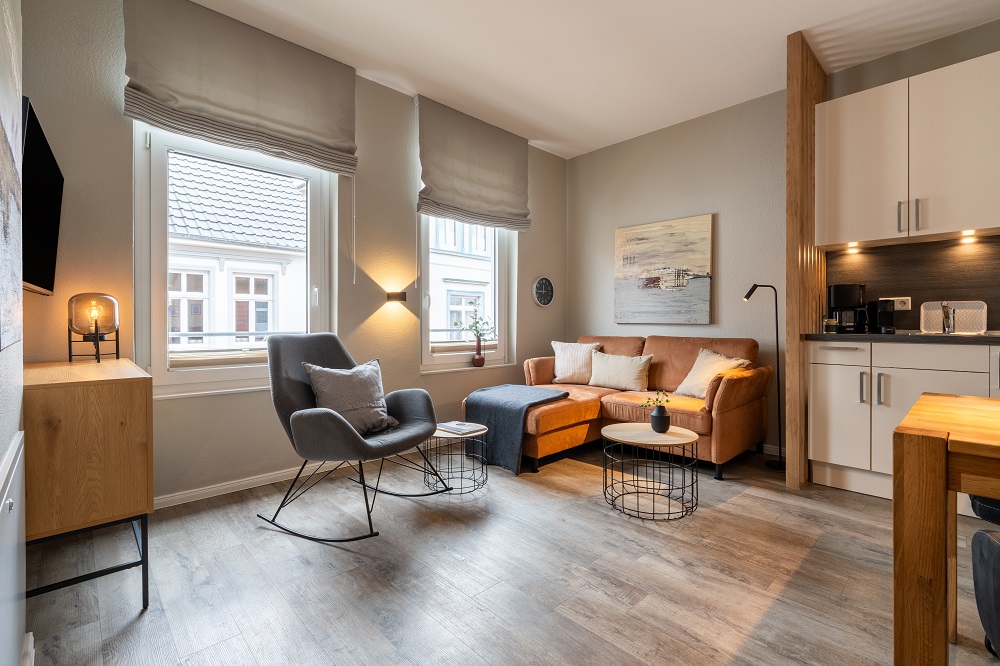 Im kombinierten Wohn- und Essbereich können Sie die Seele baumeln lassen. Die kleine, integrierte Küchenzeile bietet Ihnen alles, um im Urlaub kleine Mahlzeiten zuzubereiten. Im separaten Schlafzimmer mit Doppelbett werden Sie erholsame Nächte verbringen. Auch das moderne Bad mit bodengleicher Dusche lässt keine Wünsche offen. Die Mitnahme eines Hundes ist für einmalig 20,00 € und einem Preis von 10,00 € pro Nacht möglich. Eine Waschmaschine und ein Wäschetrockner, jeweils mit einem Münzautomat, stehen für die Allgemeinheit zur Verfügung.